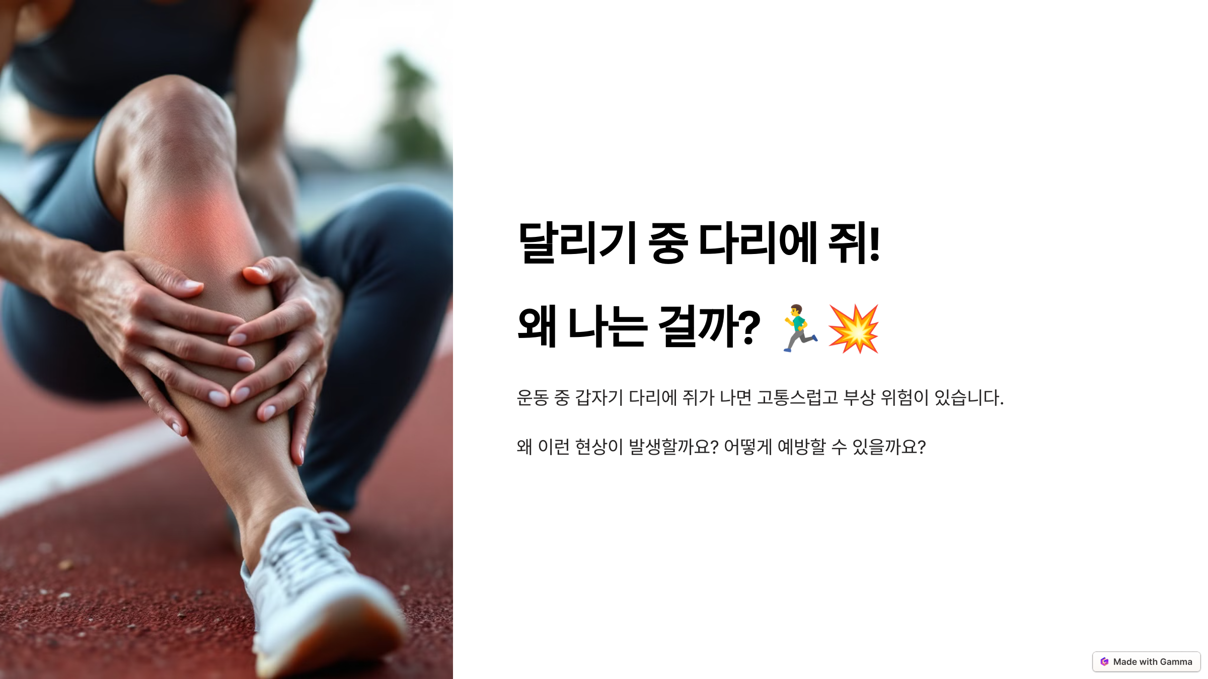운동을 하다 보면 갑자기 다리에 쥐가 나서 당황했던 경험, 한 번쯤 있으시죠? 특히 달리기 중에 종아리나 허벅지가 갑자기 경련을 일으키면 고통스러울 뿐만 아니라 부상으로 이어질 수도 있어요. 그렇다면 왜 이런 현상이 발생하는 걸까요? 그리고 어떻게 예방할 수 있을까요?